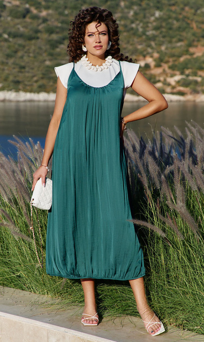 Комплект женский состоящий  из блузы молочного оттенка и верхнего платья на бретелях, будто создан для того, чтобы приковывать к себе взгляды окружающих. Платье отлично подойдёт для жаркого летнего дня: будь то прогулка по пляжу, встреча с друзьями в кафе или свидание. Образ можно дополнить небольшой аксессуарами, чтобы предать образу завершённости. Легкий, летящий, буквально невесомый силуэт подчеркнет красоту вашей фигуры и скроет недостатки, а также станет отличным дополнением в Вашем гардеробе.