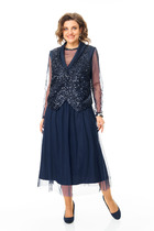 Длина блузы от верхней точки плечевого шва до низа 66  см (р.50-54), 67 (р.56-60). Длина рукава от горловины 26,5 см (р.50-54), 29,5 см (р.56-60). Длина юбки без пояса  88 см, ширина пояса 4 см.