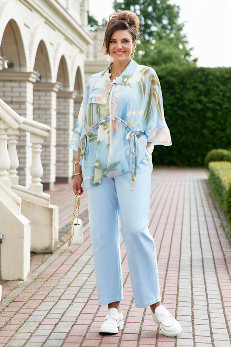 Комплект женский, трёх-предметный, состоящий из блузки, блузы и брюк. Блузка свободного силуэта, с центральной застёжкой на тесьму молнию по переду; воротник в блузке отложной, ассиметричный. В качестве отделочного элемента по переду блузки- кулиса со шнуром из основной ткани. Рукав цельнокроеный, длиной 7/8, с притачной манжетой. По спинке отрезная кокетка. Низ в блузке ассиметричный. Блуза прямого силуэта с округлой формой горловины и нагрудными вытачками по полочке. Спинка без особенностей. Брюки прямого силуэта, по переду застежка на тесьму молнию в гульфике и пуговицу в поясе. По переду брюк наклонные карманы. Пояс притачной со шлёвками, вставкой эластичной тесьмы резинки в «бочках» пояса и вставкой фигурной кокетки по задним деталям брюк. По задним половинкам брюк накладные карманы.