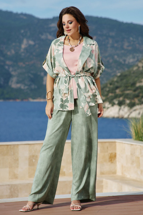 Просто роскошный комплект, который обязан быть в гардеробе у каждой модницы! Подойдет для офиса, прогулок и встреч. Невероятный принт, текстура ткани и крой создадут образ, в котором вы будете блистать. Он так же идеален для повседневных образов, путешествий, а приятная к телу ткань создаст комфорт при носке.  Комплект женский, трехпредметный состоящий из жакета, блузы и брюк. Жакет прямого силуэта без застёжки с воротником пиджачного типа. По спинке жакета отрезная кокетка. Рукав в жакете цельнокроеный с отложной манжетой по низу и декоративной патой фиксирующейся пуговицей. В боковых швах от низа разрезы, в комплекте пояс из основной ткани с декоративной пряжкой- полукольцами. Брюки прямого силуэта, длинные. Пояс в брюках притачной с эластичной тесьмой-резинкой, которая обеспечивает максимально комфортную посадку на любой тип фигуры. В боковых швах прорезные карманы. Жакет с цветочным принтом и  прямые брюки пастельного оттенка в тон, месте они создают гармонию, где каждая деталь дополняет другую, а не перетягивает внимание.  Блуза прямого силуэта является акцентным пятном в данном комплекте. Горловина округлой формы, по переду нагрудные вытачки. Спинка без особенностей. В боковых швах от низа блузы разрезы. Это образ для женщины, которая ценит и смелость, и элегантность, которая не боится выделяться, но делает это со вкусом. Она понимает, что настоящая стильность — не в количестве деталей, а в их идеальном сочетании. Комплект становится метафорой самой женщины: с одной стороны — творческая, яркая, выразительная, с другой — собранная, целеустремленная, основательная. И в этом противоречии рождается совершенство. Длина жакета 73,5 см (р 52-56), 74 см (р 58-62), длина рукава 35 см (р 52-56), 38 см (р 58-62). Длина блузы 65,5 (р 52-56), 66 см (р 58-62), длина рукава 8 см (р 52-56), 8,5 см (р 58-62). Длина брюк 108 см (р 52-56), 108,5 см (р 58-62).