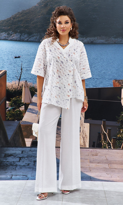 Этот комплект прекрасно подойдет для праздничного выхода и повседневной носки. Блузка выполнена из эффектной ткани с необычной вышивкой в виде бахромы и в романтичный цветочный принт очень актуальный в этом сезоне. Блузка прямого силуэта, свободного кроя без застежки на запах и ассиметричным низом по переду. В боковых швах разрезы. Горловина обработана изящной планкой с модельной стойкой. Рукав втачной, свободный с небольшим разрезом по низу. Спинка блузки с ассиметричным кокетливым подрезом. Разное направление бахромы в блузке подчеркивает игривость модели. Брюки прямого силуэта с притачным поясом  с эластичной резинкой, которая обеспечивает удобную посадку на любой тип фигуры. Брюки выполнены из струящейся ткани с креп эффектом, что прекрасно придает образу легкость и неповторимость. Длина блузы 74 см (р.50-54), 74,5 см (р.56-60). Длина рукава 27 см. Длина брюк 108 см.