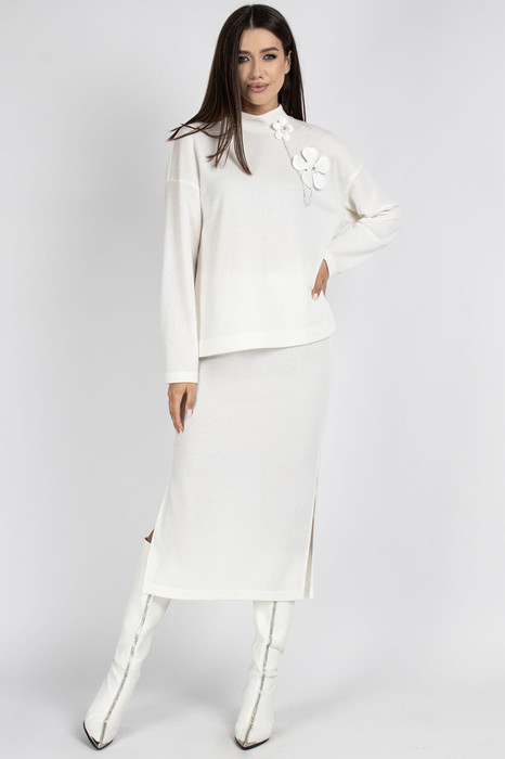 Юбка прямого силуэта, на подкладке. В боковых швах юбки имеются разрезы.