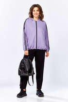 Костюм женский из трикотажного полотна в комбинации двух видов: полотна "кулирка-кармеланж" и полотна "кулирка" с набивным тематическим рисунком, состоящий из футболки и брюк. Футболка - модного силуэта, слегка укороченная свободного покроя, с приспущенным плечом, с втачными рукавами длиной до локтя, горловиной овальной формы, обработанной втачной планкой и принтом в центре переда. По шву втачивания планки настрочена декоративная (5-ниточная) отделочная строчка нитками контрастного цвета Подгибка низа рукавов и изделия так же выполнена с применением декоративной отделочной строчки. Брюки выполнены из полотна с набивным тематическим рисунком, длинные, умеренной ширины, прямые, с эластичной тесьмой по талии.