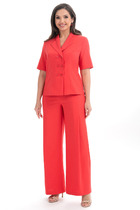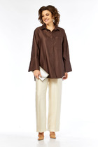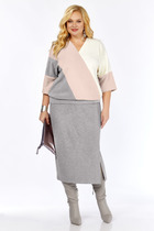 Костюм женский из трикотажного полотна "кулирка" в комбинации двух видов: гладкокрашенного и с рисунком в крупную клетку, сочетающихся между собой по цвету, состоящий из джемпера и брюк. Джемпер - из гладкокрашеного полотна, свободного покроя, с длинными втачными рукавами и приспущенными плечами, с горловиной овальной формы и тематическим принтом, выполненным в технике шелкографии. Горловина, нижние срезы рукавов и низ изделия обработаны подгибкой с отделочным широким кантом контрастного цвета. Брюки - из полотна в клетку, свободного покроя, прямые, на притачном поясе с эластичной тесьмой внутри, с карманами в боковых швах. Нижние срезы обработаны подгибкой.