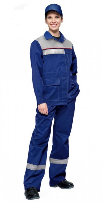 Женский рабочий костюм прямого силуэта состоит из куртки и брюк: Куртка: - с центральной супатной застежкой на петли и пуговицы - с кокетками полочек и спинки из отделочной ткани, шов стачивания с нижней частью куртки выделен красным кантом - широкая лента СОП на правой стороне куртки и на спинке - накладные карманы с клапаном в нижней части куртки и на уровне груди левой полочки, линия входа в карман ограничена красными закрепками - воротник отложной - рукава с манжетой на петле и пуговице - внутренняя кулиска по талии со шнуром, концевиками и фиксаторами для регулировки ширины Брюки: - с притачным поясом со шлевками и фиксированной резинкой по боковым сторонам - с центральной супатной застежкой на петли и пуговицы - боковые карманы, линия входа в карман ограничена красными закрепками - широкая лента СОП в нижней части брюк - средний и частично боковые швы усилены отделочной строчкой
