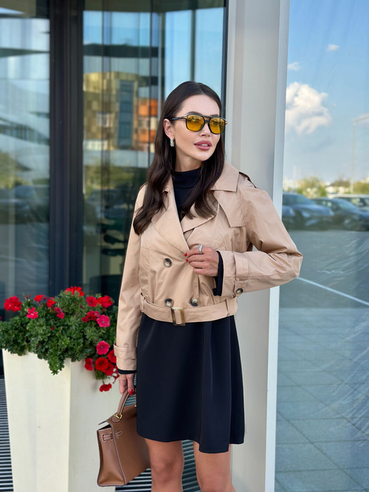 Тренч укороченный, на подкладке. Рукав прямой, длинный, реглан. По переду обработаны втачные карманы. Паты обработаны по плечевым швам и на манжетах. Паты пришиты на пуговицы. По низу тренча обработаны шлёвки и съёмный пояс. Застёжка - 2 ряда пуговиц по центру переда.