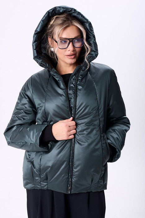 Куртка женская с центральной застежкой на тесьму-молнию. По спинке рельефные швы от горловины до низа, по низу заложены складки. По переду рельефные швы от горловины до низа, по низу заложены складки, обработаны карманы с втачной вытачкой. Рукав полуреглан 2шовный. Капюшон с центральной частью и отделочной деталью по отлету. В качестве отделки используется фурнитура. Утеплитель синтепон 150 гр.