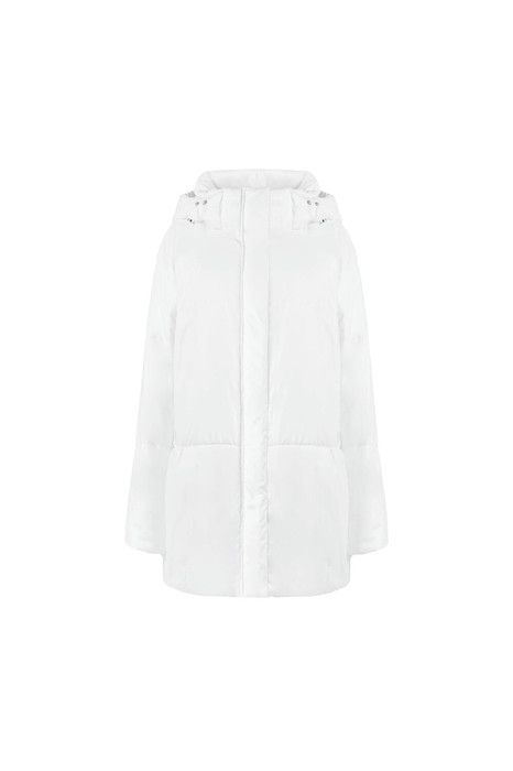 Куртка женская плащевая, утепленная, стеганая на утеплителе ISOSFT 200 гр, прямого силуэта зауженная к низу, длиной до середины бедра, на подкладке. Застежка на молнию и потайные пробивные кнопки по планке. На переде карманы в рельефе. Рукав длинный. Воротник стойка + капюшон, пристегивающийся на молнию и липучую тесьму.