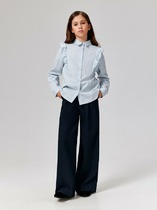 Верхняя блузка свободного силуэта. Перед и спинка цельнокроеные. Горловиа кругло формы, обработана бейкой из трикотажного кулирного полотна. Рукав втачной короткий, слека спущен. Нижняя блузка из трикотажного кулирного полотна на брителях. Верхняя и нижняя часть изделия соединины лентой атласной SFLA-1