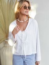 Укороченная женская блузка А-образного силуэта из хлопкового поплина – плотного текстильного полотна, которое отлично держит форму. Сзади блузка застегивается на пуговицы. Рукава широкие и прямые, длиной до локтя. Линия плеча удлиненная, с необычной складочкой. Идеально решение для ваших стильных образов!
