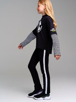 Брюки со середней посадкой. Пояс отрезной с внутренней эластичной тесьмой 30RV. Брюки расклешенный к низу. По центру передней части брюк расположен шов, по низу изделия разрезы.