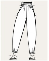 Брюки Свободного силуэта, расклешенные. Пояс цельнокроеный с резиной внутри 40RV. В боковых швах карманы в рамку. Низ впогибку.