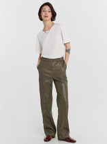 Брюки женские прямого силуэта из трикотажного полотна под «кожу». Пояс цельнокроенный внутри обработан жаккардовой тесьмой. В боковом шве обработана застежка на молнию. На задней детали вытачки. На передних деталях членение чуть выше колена.