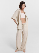 Брюки прямые свободные. Пояс цельнокроеный с эластичной тесьмой внутри. С внешней стороны пояса пробиты петли и втянут шнур (8KXW-1 8мм.) с узлом на концах. В боковых швах обработаны карманы. Подкладка кармана из основного полотна. Низ брюк обработан швом впобгибку с эластичной тесьмой внутри.