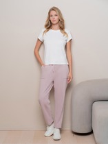 Брюки прямого силуэта. Посадка средняя. Пояс цельнокроеный с эластичной тесьмой внутри (вн. 20мм 20RV). С внутренней стороны пробиты петли и втянут шнур (хб тесьма 10мм) с застроченными концами. В боковых швах обработаны карманы. Подкладка карман из кулирки.