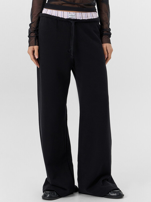 Черные женские брюки прямого свободного кроя сочетают в себе повседневный комфорт и изысканную деталь. Модель со средней посадкой дополнена изящным декоративным элементом по верхнему срезу — тонкой текстильной вставкой, стилизованной под край нижнего белья. Эта деликатная деталь придает образу игривую нотку и особый шарм, оставаясь при этом тактично скрытой под одеждой.