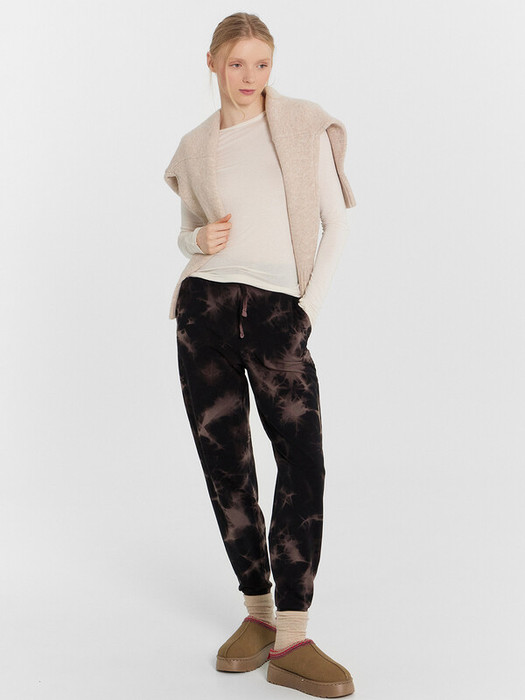 Брюки изготовлены из трикотажного полотна футер. Брюки прямые с высокой посадкой. Пояс отрезной из рибаны с эластичной тесьмой внутри. В передней части пояса с лицевой стороны пробиты петли и втянут шнур. Шов втачивания пояса распошит. Спереди обработаны карманы хулиганы. По низу брюк отрезные манжеты из рибаны.
