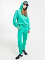 Брюки изготовлены из трикотажного полотна футер. Брюки прямые с высокой посадкой. Пояс отрезной из рибаны с эластичной тесьмой внутри. В передней части пояса с лицевой стороны пробиты петли и втянут шнур. Шов втачивания пояса распошит. Спереди обработаны карманы хулиганы. По низу брюк отрезные манжеты из рибаны.