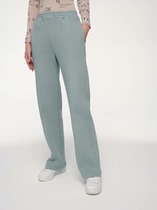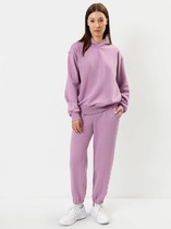 Брюки изготовлены из трикотажного полотна футер. Брюки прямые с высокой посадкой. Пояс отрезной из рибаны с эластичной тесьмой внутри. В передней части пояса с лицевой стороны пробиты петли и втянут шнур. Шов втачивания пояса распошит. Спереди обработаны карманы хулиганы. По низу брюк отрезные манжеты из рибаны.