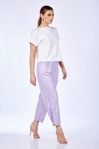 Брюки с посадкой на талии свободного силуэта. Пояс цельнокроеный с резиной внутри 20RV. По центру пояса пробиты петли, протянута бейка из основного полотна. На передних деталях карманы «хулиганы». Низ изделия застрочен швом в подгибку.