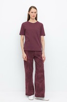 Брюки с посадкой на талии свободного силуэта. Пояс цельнокроеный с резиной внутри 20RV. По центру пояса пробиты петли, протянута бейка из основного полотна. На передних деталях карманы «хулиганы». Низ изделия застрочен швом в подгибку.