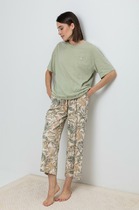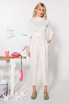 Посадка брюк средняя. Пояс цельнокроеный с эластичной тесьмой внутри. Низ брюк обработан в подгибку.