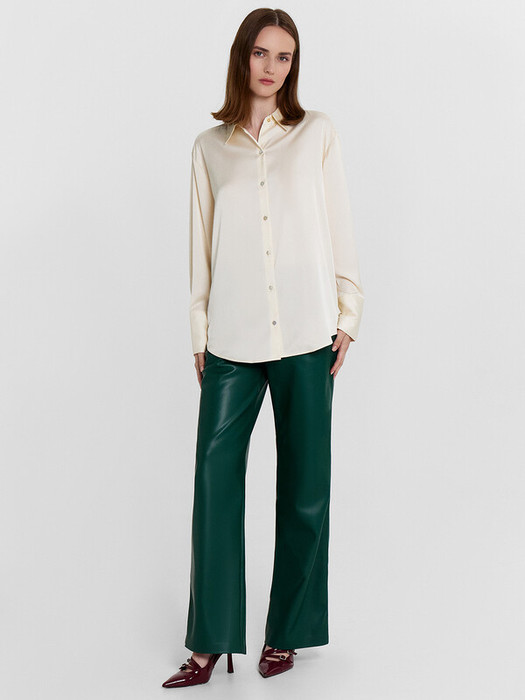 Брюки женские свободного силуэта из трикотажного полотна «под кожу». Пояс отрезной из основного полотна с эластичной тесьмой внутри (20мм 20RV). На передних деталях обработаны карманы-хулиганы. Подкладка кармана из подкладочной ткани. На правой передней половинке проложена декоративная строчка - имитация гульфика. Нижние срезы брюк подклеены.