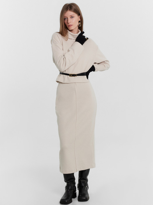Джемпер свободный, укороченный. Горловина круглой формы с воротником стойкой. Рукава втачные длинные, плечо спущено. Нижние срезы джемпера и рукавов обработаны швом вподгибку.
