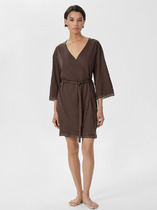 Халат прямого силуэта, длина до колен. Спинка цельнокроеная. Халат с запахом, со съемным поясом, продетым в шлевки в боковых швах. На уровне талии притачены завязки для дополнительной фиксации левой полы халата. Концы пояса свободно завязываются. Рукава длинные. Срезы борта и горловины.