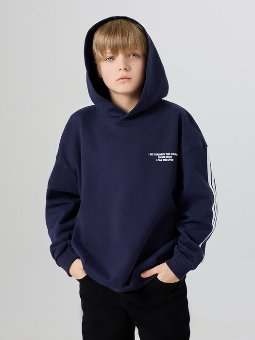 Худи для мальчиков, свободного силуэта (оверсайз), с капюшоном. Горловина округлой формы. Капюшон со средним швом, на подкладке из основного полотна. Плечо спущено, рукав втачной длинный, па рукаву настрочены лампасы. По низу рукава отрезная манжета из рибаны. Пояс отрезной из рибаны, отстрочен.