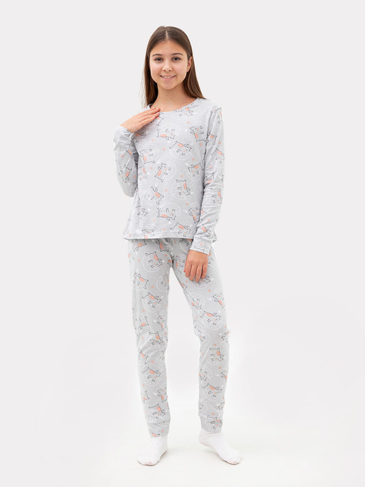 Уютная хлопковая пижама для девочки. Широкие эластичные манжеты на рукавах лонгслива и штанинах брюк. Интересный симпатичный дизайн. Продуманная конструкция. Идеальный вариант для приятного сна и расслабленного отдыха