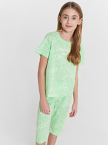 Комплект состоит из рубашки и шорт. Рубашка прямого силуэта, с отложным воротником, спинка цельнокроеная. Плечо слегка спущено. Рукав втачной, одношовный, короткий. Центральная застежка на пуговицы.