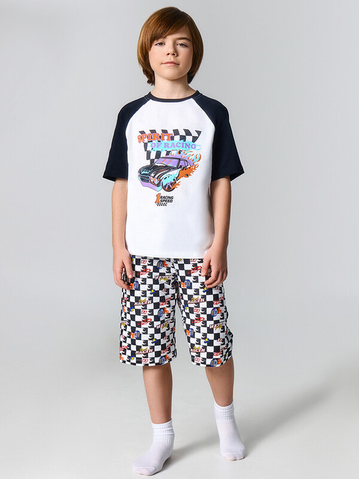 Шорты свободные, прямые. Пояс цельнокроеный с эластичной тесьмой внутри (внутрення резина 30RV), ширина 30 мм. Низ джемпера, рукавов и брюк обработаны на 2-х игольной плоскошовной машине швом в подгибку.