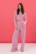 Брюки с посадкой на талии, прямого силуэта. Пояс цельнокроеный с резиной внутри. Низ брюк обработан швом в подгибку.