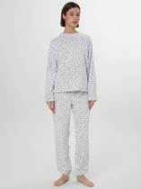 Свободный джемпер прямого кроя с круглой горловиной и длинными рукавами реглан обеспечивает полную свободу движений. Брюки со средней посадкой на мягком поясе с широкой резинкой удобно сидят по фигуре. Слегка зауженные к низу, они завершаются эластичной тесьмой для идеальной посадки, не стесняя движений во время сна или отдыха.