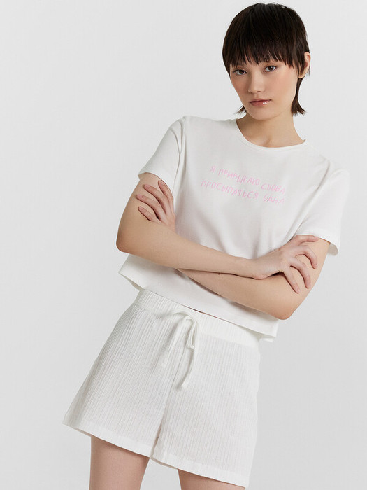 Джемпер длиной до середины бедер, силуэт - прямой. Полочка и спинка цельнокроенные. Горловина круглой формы, обработана бейкой. Рукава втачные, короткие. Низ рукавов и джемпера обработаны швом вподгибку. Шорты прямого силуэта, короткие. Перед и спинка цельнокроеные. Пояс цельнокроеный, с втаченной эластичной тесьмой. На поясе имитация завязки - шнур из основного полотна, выполненного из бейки в 4 сложения, концы шнура застрочены. Низ шорт обработан швом вподгибку.