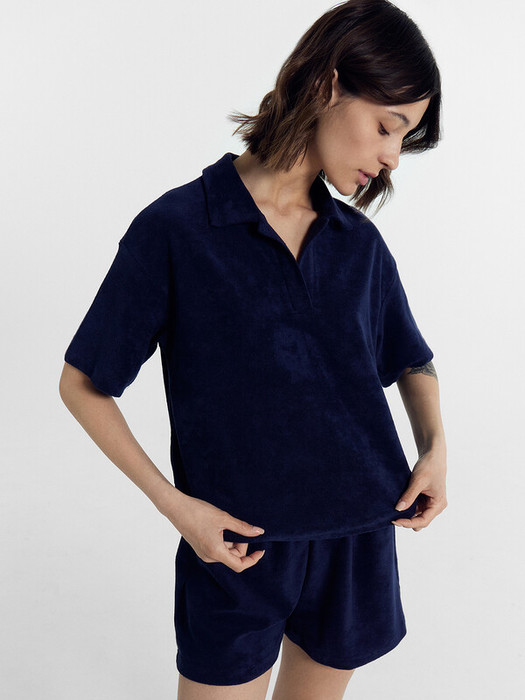 Комплект состоит из джемпера и шорт. Джемпер свободного силуэта. Перед и спинка цельнокроеные. Горловина обработана воротником «поло». Рукава втачные, длиной до локтя, со спущенной линией плеча. Низ изделия и рукава в подгибку. Шорты свободного силуэта, короткие. Перед и спинка цельнокроеные. Пояс цельнокроеный, с втаченной эластичной тесьмой. Низ шорт обработан швом в подгибку..