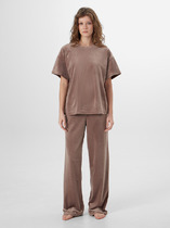 Комплект женский состоит из футболки и шорт. Футболка свободного силуэта. Горловина круглой формы, обтачка из основного полотна. Рукава короткий, реглан. Нижний срез футболки и рукавов обработан швом вподгибку.