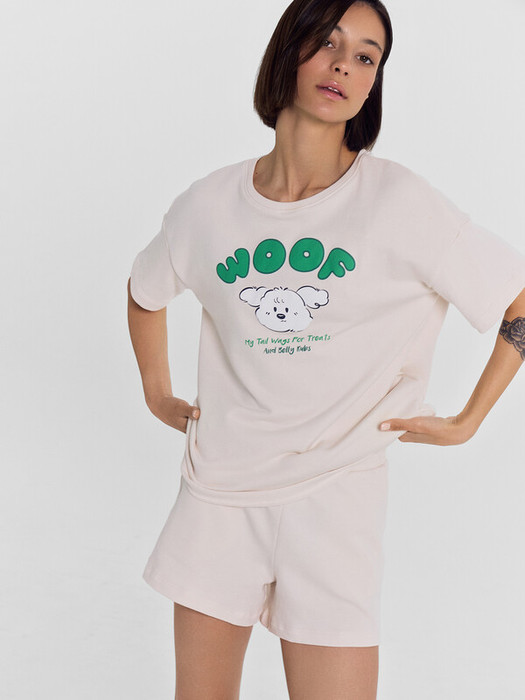 Комплект женский состоит из футболки и шорт. Футболка свободного силуэта. Горловина круглой формы, обтачка из основного полотна. Рукава втачные свободные, линия плеча слегка спущена. Низ рукавов и футболки в подгибку.