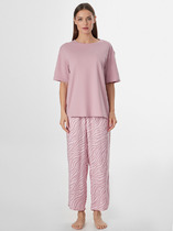 Комплект состоит из рубашки и брюк (182508). Рубашка полуприлегающего силуэта, укороченная. Горловина круглая, воротник рубашечный. По переду застежка на петли и пуговицы (D 10мм). Рукава втачные короткие. Нижний срез фигурный. Нижний срез рубашки и рукавов обрвботан швом вподгибку. Брюки прямые, свободные. Посадка средняя. Пояс цельнокроеный, с эластичной тесьмой внутри (внутр. 50мм 50RV). В боковых швах обработаны карманы. Брюки слегка укорочены, подгибка низа широкая.