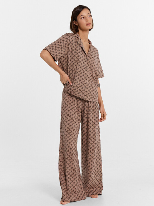 Комплект женский состоит из рубашки и брюк. Рубашка свободного силуэта, с отложным воротником. Рукав втачной короткий, линия плеча немного спущена, рукав обработан вподгибку. Рубашка с центральной застежкой с петлями и пуговицами. Низ застрочен швом в подгибку.