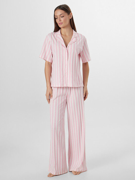 Рубашка с отложным воротником и короткими рукавами создает элегантный расслабленный образ. Центральная застежка на пуговицах и аккуратная обработка всех швов подчеркивают качество исполнения. Брюки с эластичным поясом на кулиске мягко сидят на талии, не стесняя движений.