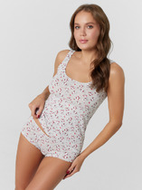 Топ прилегающего силуэта. Перед и спинка цельнокроеные. Горловина U-образной формы, окантована бейкой. Спинка и пройма окантована бейкой, переходящей в бретель, в бретелях жилка тканая 8мм девсел 13460W, WT4-8. Низ майки обработан в подгибку.
