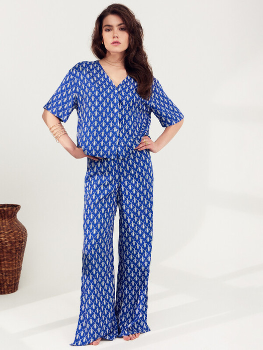 Комплект женский состоит из жакета и брюк. Жакет свободного силуэта. Рукав втачной короткий, рукав обработан вподгибку. Срезы борта обработаны подбортом из основного полотна. Жакет с центральной застежкой с петлями и пуговицами. По боковым швам разрезы. Низ застрочен швом в подгибку. Брюки свободного силуэта. Пояс цельнокроеный, с резиной внутри. По боковым швам разрезы. Низ брюк обработан вподгибку.
