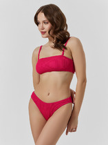 Бюстгальтер купальный бандо, со съемными бретелями. Лиф на подкладке, со съемными чашками-вкладышами  (GNv-15m).  Верхний и нижний срезы обработаны швом вподгибку с эластичной резиновой тесьмой внутри 10 мм. Съемные бретели из основного полотна с эл резиновой тесьмой 7 мм внутри, с регулировкой по длине. Регуляторы (2 шт) и застежки-крючки (4 шт) металлические с гальваническим покрытием. Бретели крепятся к бюстье черз петлю, заготовленную из парфюмерной ленты.