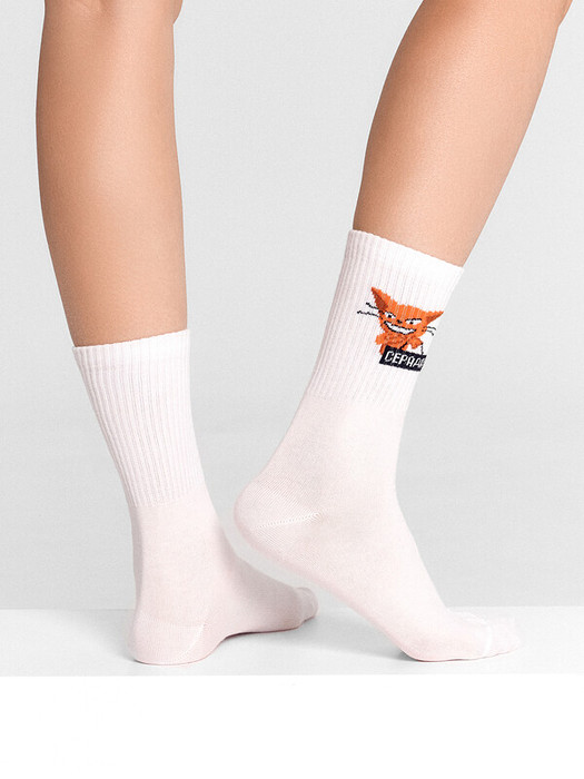 рис.2666 Женский носок с  высоким плотным бортом и рисунком в виде котика с надписью.