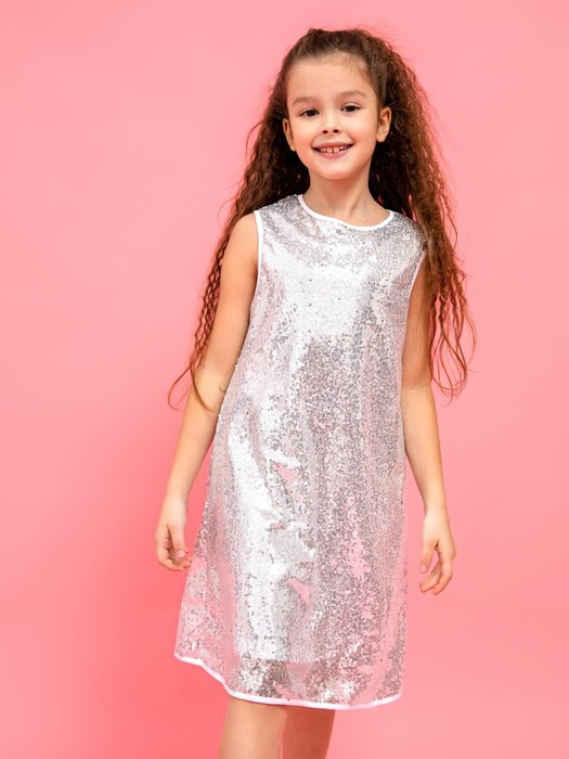 Платье А-силуэта без рукавов. Подкладка переда и спинки из кулирного полотна. Верхняя часть платья - пайетки. Горловина круглая. По спинке застежка-капелька на пуговицу. Горловина, проймы и низ изделия оконтованы.