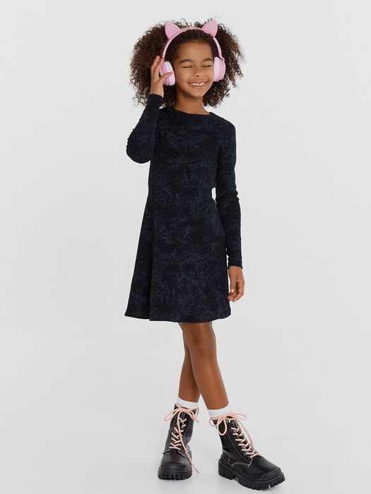 Платье для девочек прилегающего силуэта из трикотажного полотна рибана. Горловина круглой формы обтачка из основного полотна. На детали переда декоративные членения. Рукав втачной, длинный, узкий. Платье к низу расширяется. Низ изделия и руковов обработаны швом в подгибку.