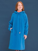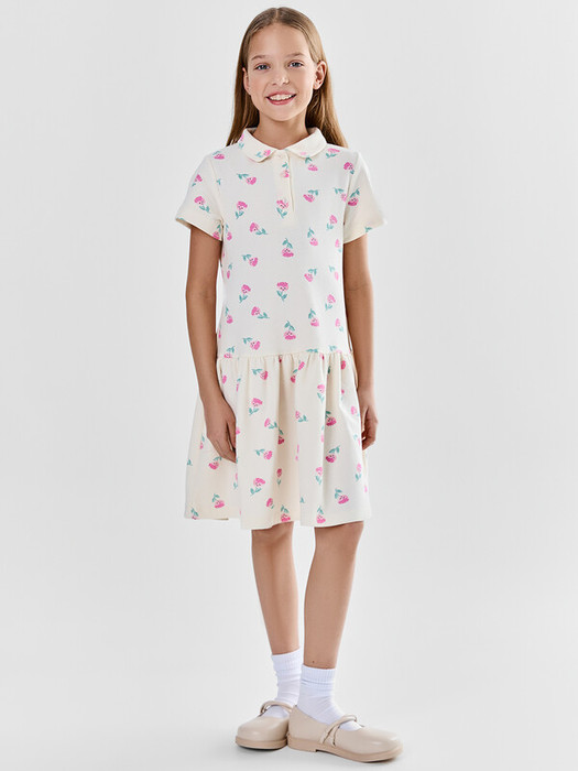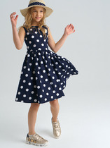 Платье для девочек А-силуэта. С короткими рукавами. С воротником-поло. Линия втачивания воротника закрыта бейкой из основного полотна. Застежка на пуговицы. (d= 10 mm.) Низ изделия  и рукавов обработан на 2-х игольной плоскошовной машине швом в подгибку.