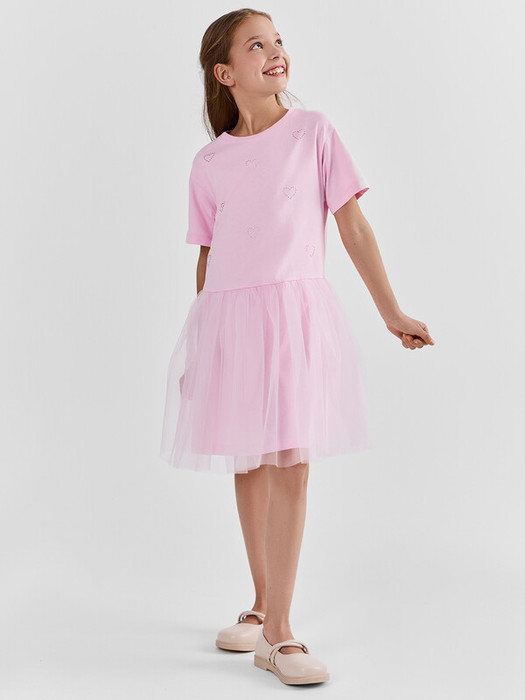 Платье для девочек свободного силуэта с отрезной юбкой.  Горловина округлой формы обработана обтачкой  из рибаны. Рукава втачные, корткие. Юбка трехслойная на сборке. Верхние два слоя из полотна трикотажного сетки, подкладка из полотна трикотажного кулирного.